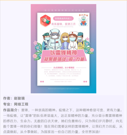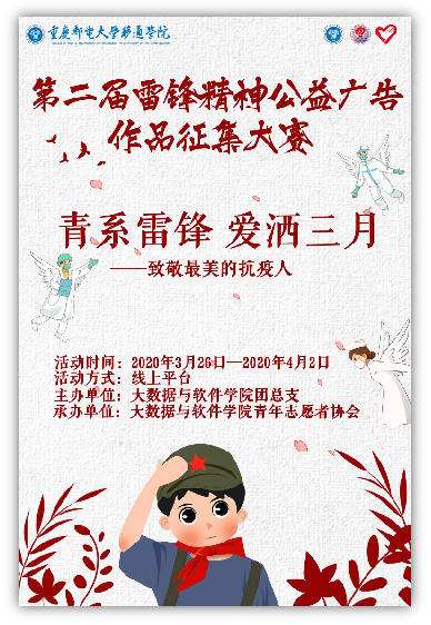 2020年3月26日至2020年4月6日,由大数据与软件学院团总支主办,大数据与软件学院青年志愿者协会承办的第二届雷锋精神公益广告作品征集大赛青系雷锋·爱洒三月—“致敬最美的抗疫人”活动圆满落下帷幕。