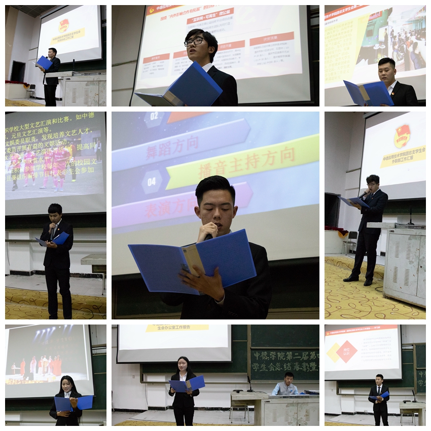 接下来,中德学院团总支学生会13个部门的部长依次上台用热情洋溢的演讲结合PPT或者视频对自己在2018-2019学年第一学期的工作进行总结并提出第二学期的工作计划。各位部长代表自己部门简要阐述了在过去一学期中组织参与的学生活动和积累的活动经验,并提出了一些工作中的不足之处和改进措施。