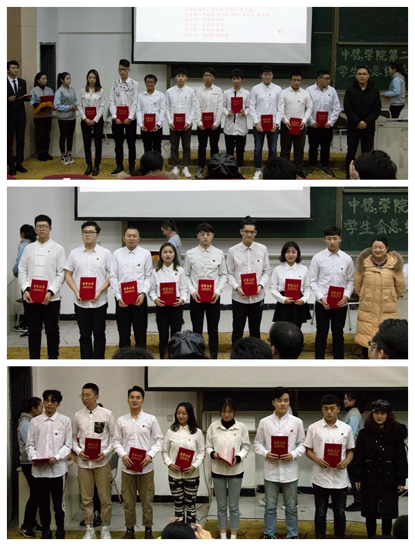 接下来,为树立典型、表彰先进,大会表彰了在本学期的学生活动中表现优异的部门干事。来自13个部门的39位优秀干事依次上台领奖。本学期他们工作认真,做事严谨;他们热爱学习,勤奋刻苦;他们善于思考,乐于助人;他们起到了模范带头作用,是同学们学习的榜样,希望他们在今后的学习和工作中再接再厉。