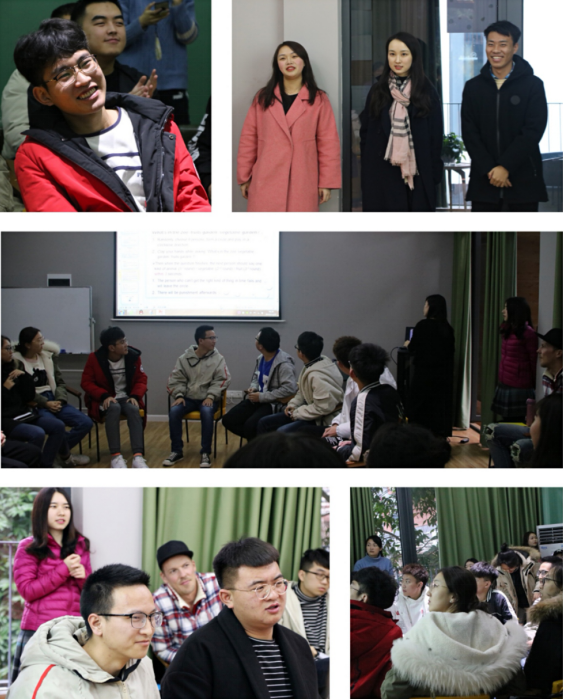 为了很好地融合互动,破冰游戏必不可少。每个学生都有随机分配一个动物/水果/蔬菜的名字,为了找到自己的组织,学生需要相互询问以此来认识彼此。大屏幕上的演示文稿中有对话事例,当然也非常鼓励学生能有自己的即兴发挥,让其有针对性地就如何和陌生人开启一段对话得到锻炼。