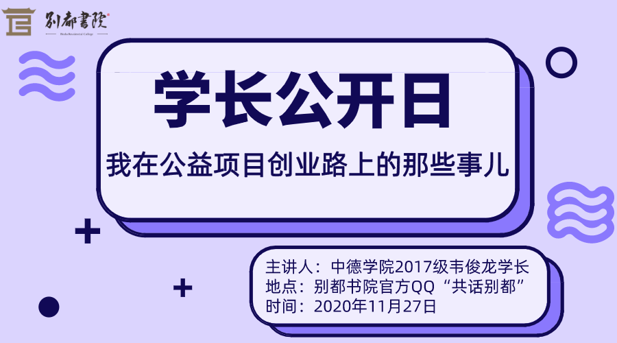 “读万卷书不如行万里路,行万里路不如阅人无数,阅人无数不如贵人相助,贵人相助不如自己去悟。”11月27日下午4点,中德学院2017级韦俊龙学长作客别都书院“学长公开日”线上直播间,分享了个人从校园就创团团队,到成立跨国公司的经历与经验,助力在校学弟学妹在完满路上理清创业创新思路,提高创新创业能力,成为励志上进、敢想敢拼、思路清晰、能承担社会责任的优秀青年。