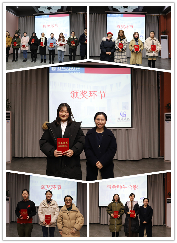 最后,迎来了激动人心的颁奖环节,分别由陈霞老师、金光美副教授、张艳老师、皮若兰老师依次为优秀奖、三等奖、二等奖、一等奖获奖学生颁发了荣誉证书并合影留恋。皮若兰老师又为优秀指导老师进行了颁奖并合影留恋。
