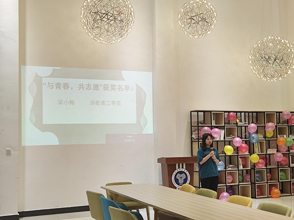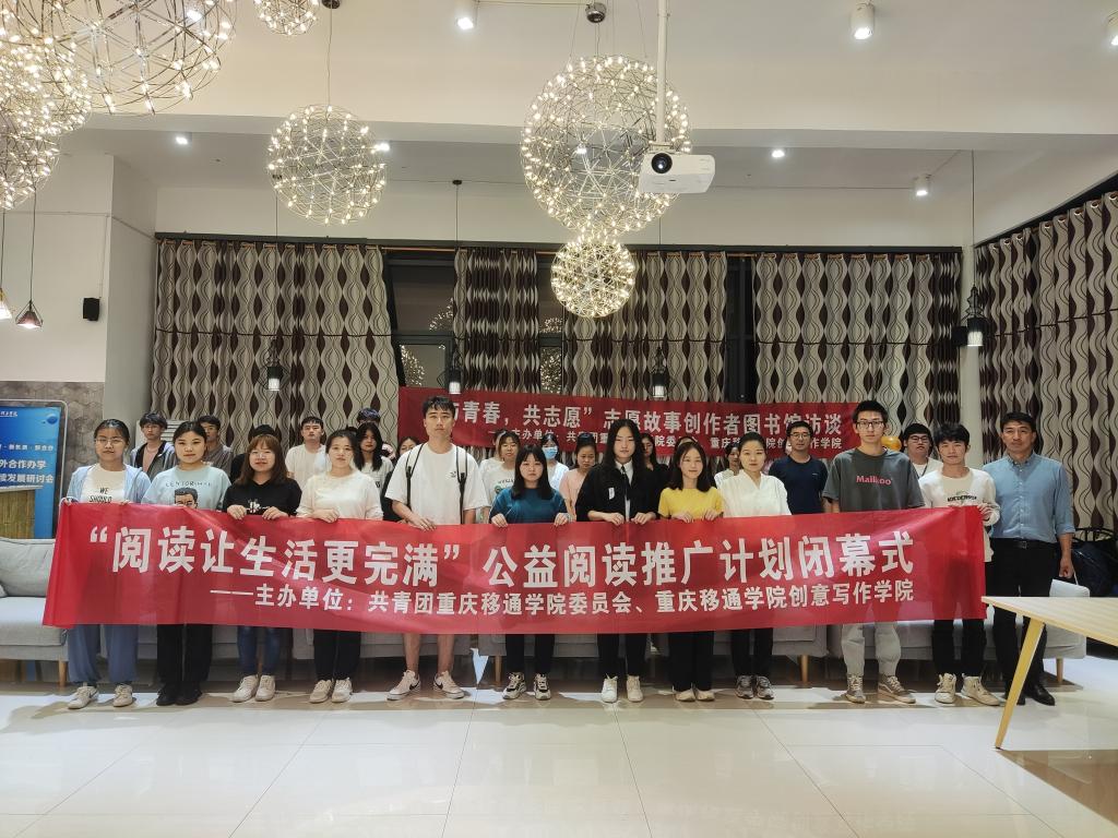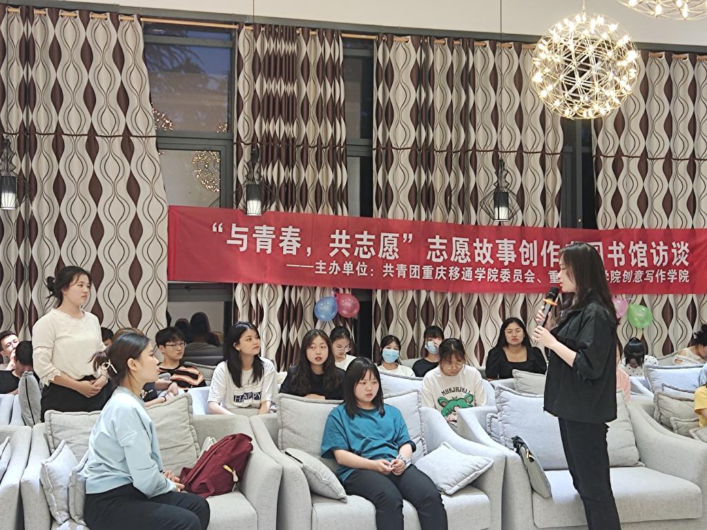 5月20日晚上7时,由共青团重庆移通学院委员会、创意写作学院主办的“阅读让生活更完满”公益阅读推广计划的最后一场活动——“与青春,共志愿”志愿故事创作者图书馆访谈活动在荷悦书院109活动厅召开,为了让同学们更好地与创作者面对面交流,此次活动特意邀请了志愿活动征文活动5位获奖者代表聂霜、王雨琳、梁小梅、杨子若、陈羽雁及指导老师代表方刚、仲心,师生们对作品创作和修改都进行了深入的沟通。