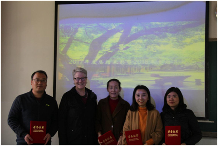 关院长满怀深情的回顾了2017年学院的发展变化,从学院报名人数和环节设置双提升;国际交流与合作不断深化;学生学习成效显著;教师规模、管理体制完善等做了全面回顾。她指出这些成绩的取得不仅得益于学校的大力支持,更得益于全体师生的默默奉献。她感谢全体教师在上一年度的辛勤付出,并对上一年度在远景学院导师工作考评中,获得远景学院“年度优秀导师”称号的强阳、李梦瑶、彭可、乌兰四位老师颁发了荣誉证书。