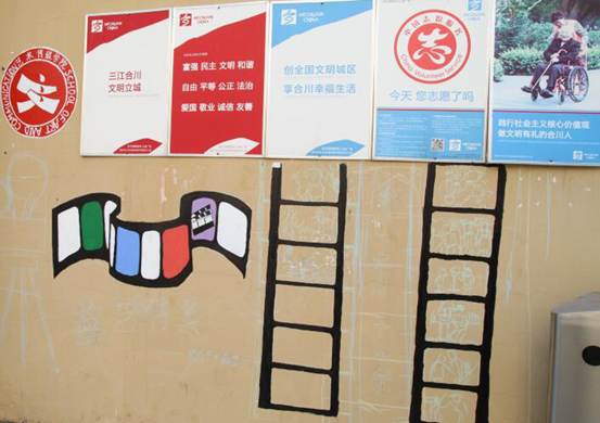 文化墙位于“小桥人家”小区的正门主体墙壁,此处往来人口密集,宣传效果显著。文化墙内容由两部分组成,一部分是配合合川区文明社区的宣传,而绘制的合川“文明十二条”主题漫画,其中用诙谐而有趣的漫画人物表现了合川区“文明十二条”,而另一部分,是由“影像”“美术”“动漫”三个大元素组成的“益艺得翼”团队文化。