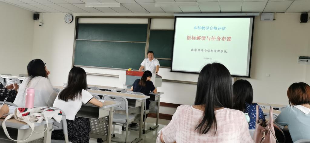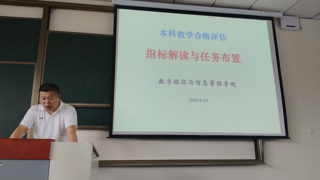 6月23日下午15:00,数字经济与信息管理学院在双栀书院403教室面向学院全体教师召开本科教学合格评估指标解读与任务布置大会。学院院长潘显兵、教学副院长刘贵容、学工副院长任瑞娟、工程管理教研室主任周梦娇和信息管理教研室主任王哲,以及全体专任教师和辅导员共计28人参加此次大会。大会由学院院长潘显兵教授主持。