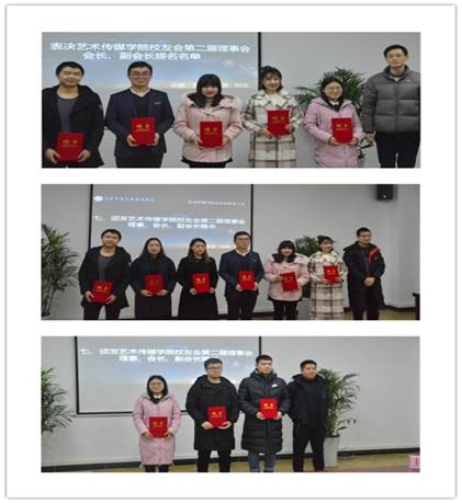 李欢老师宣读了艺术传媒学院校友会第二届理事会理事提名名单,李克伟老师宣读了艺术传媒学院校友会第二届理事会会长、副会长提名名单,会议选举产生了艺术传媒学院校友会第二届理事会理事、会长、副会长。周伟老师,陈仲华老师,杨德龙老师分别为当选校友颁发了艺术传媒学院校友会第二届理事会会长、副会长以及理事聘书。