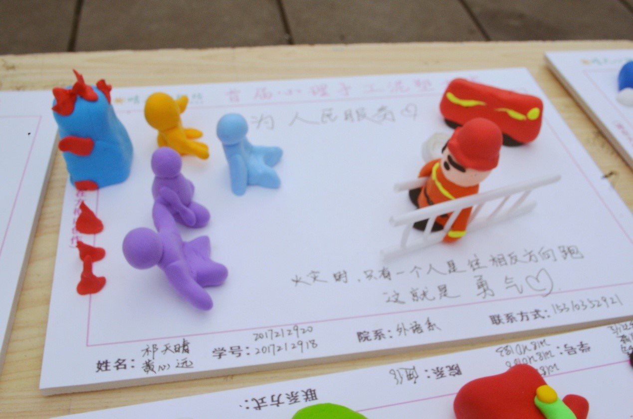 心理健康教育与咨询中心采取打破常规的心理健康教育活动形式,融合艺术加以手工制作的特色活动吸引了众多参与者。“泥塑语言”表达性心理疗法是新兴的心理学研究方法,通过游戏,活动,雕刻等艺术媒介来表达内心的想法,以一种非语言的表现形式释放内心压抑的情感经验,它不仅能够减轻心理压力,而且对提高心理健康水平有一定的积极作用。