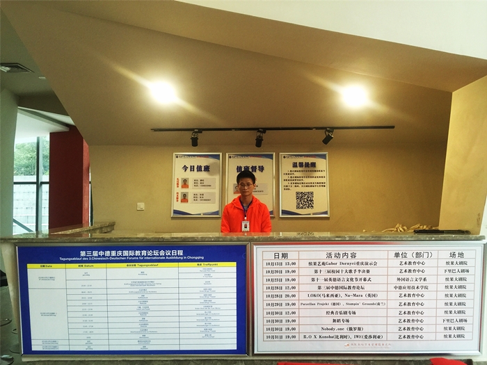2019第三届中德重庆国际教育论坛将于10月28日开幕。论坛开幕前一天,组委会工作人员正在校园内做着最后的准备工作,在酒店、车站及报到酒店,工作人员已投入到紧张而忙碌的接待工作中。校内校外,处处彰显着这三年举办一届的国际会议的浓浓气氛。