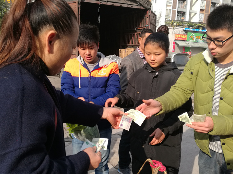 就这样,边聊着,边走着,在得知这些蔬菜是同学们在学校农场自己亲手栽种的,他们便索性要求我们就在路边先售卖一部分给大家,这不开张则已,一开张同学们就开始招架不住了,前来围观的市民越聚越多,七嘴八舌地询问,或要求付款,或要求再加点,售卖场面虽不如明星驾到般火爆,但也着实让大家激动了好一阵,原以为还要到菜市场好生吆喝,没想到种植的莴笋赢得了市民们的青睐——“疯狂抢购”!30分钟不到,满满的两筐莴笋便被一”抢”而空,大家一合计收到的现金, 137元整!这137元现金里面包含着的我们大家辛勤劳动的汗水,攥在手里的分量无比沉重!