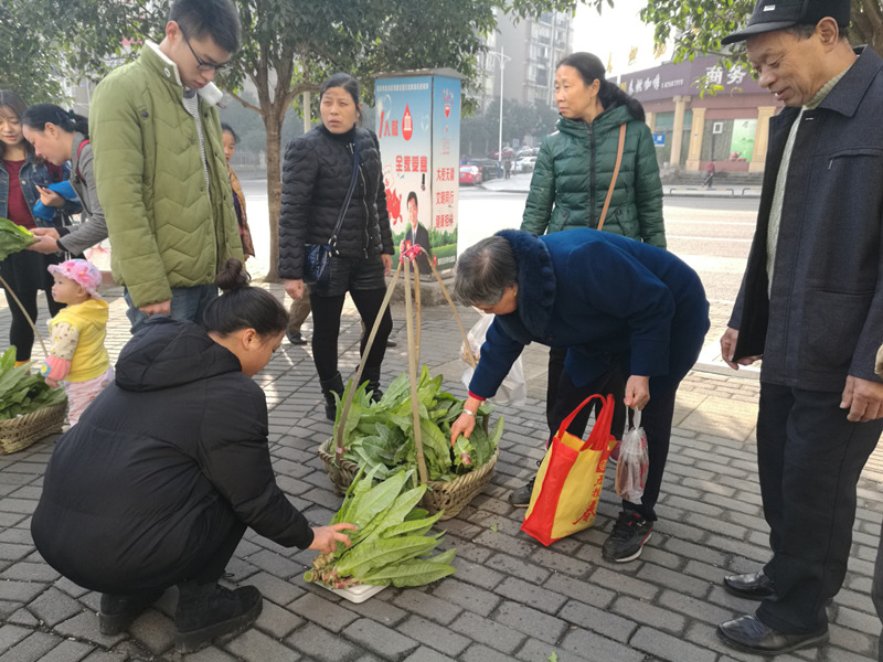 采摘完莴笋,经过粗加工,我们便动身前往今天的目的地——学校附近的义乌农贸市场,我们抬着满满两筐的莴笋,路上的行人也向我们投来了好奇的眼光,我们与同行的社区居民一起边走边聊,为他们仔细讲解个中缘由。