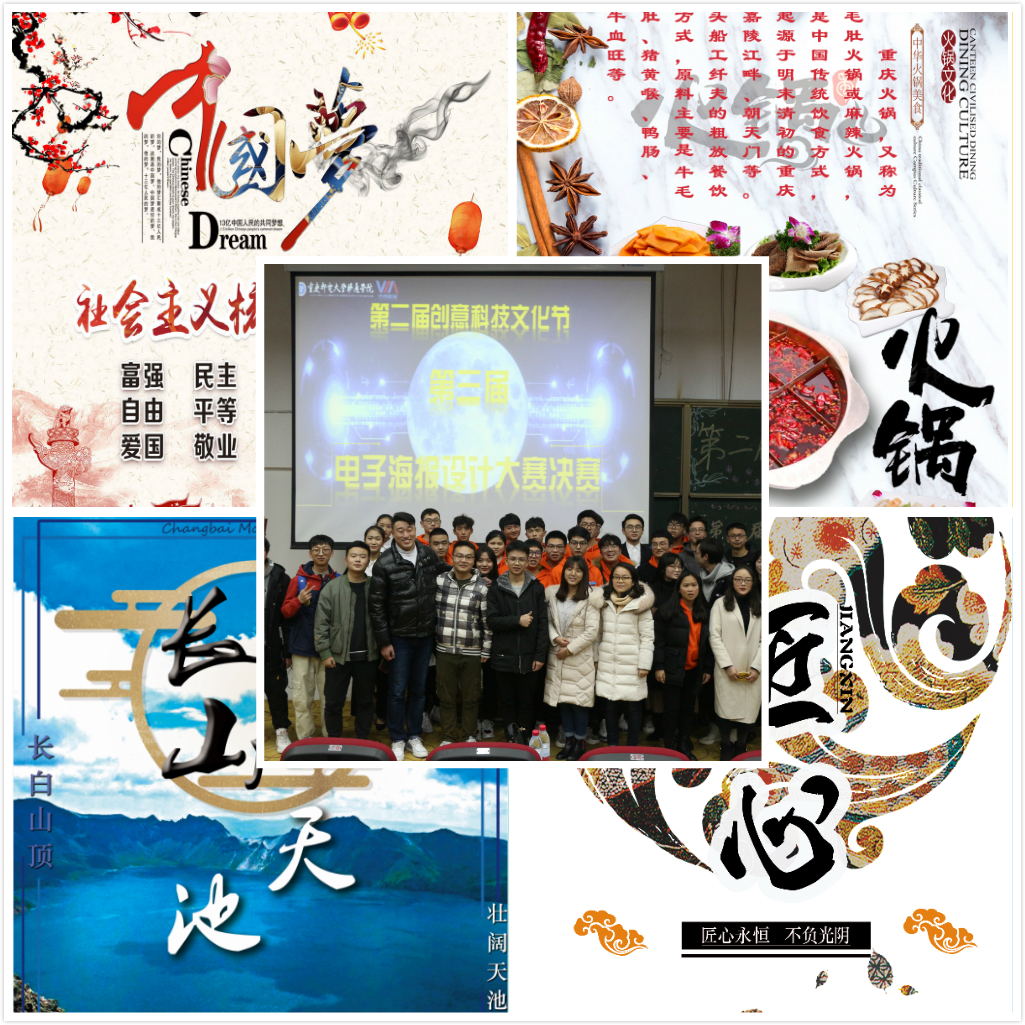 第三届“追逐中国梦,创意绘祖国”电子海报设计大赛决赛中,选手们围绕传统特色文化、精神文明教育、社会主义、祖国风貌的主题设计海报,对团队的创作灵感、色彩构图等内容详尽阐述,赢得在场观众的鼓掌喝彩。由科技协会承办的第三届“创造无极限,表情来呈现”表情包设计大赛,参赛选手们结合当下流行元素为图片配字,现场答辩展示创作灵感,你画我猜进行心与心的沟通。