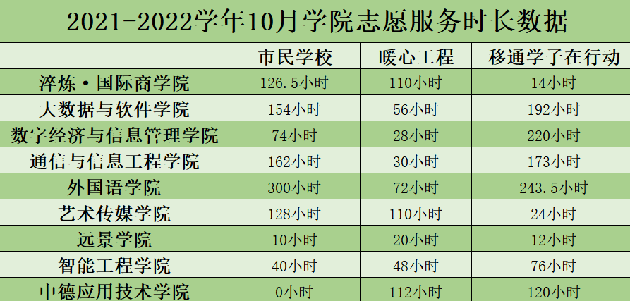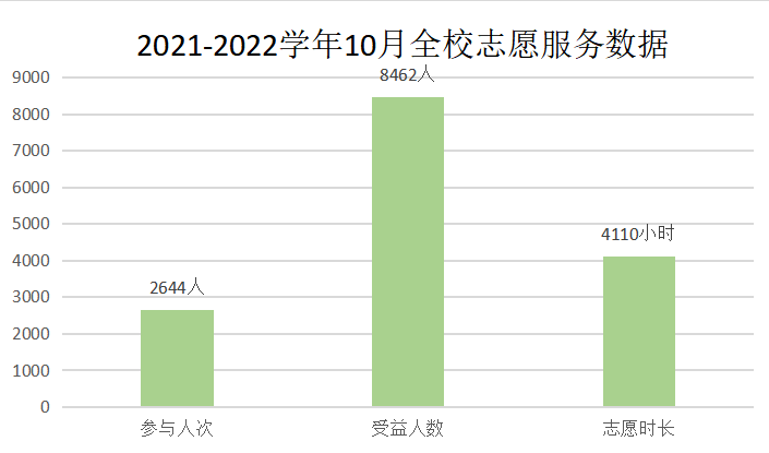据统计,已累计105期志愿服务活动,2644人次的参与人数,4110时的志愿时长,8462人次的受益人数,这就是十月份志愿服务取得的佳绩。