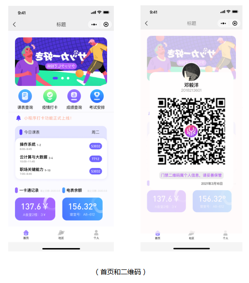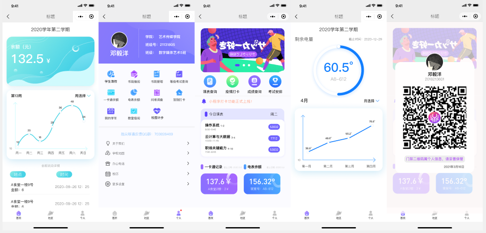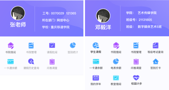 对于不常的功能,我们将其移至个人页面,通过大数据分析对功能的先后顺序进行了排列的同时还统一了icon的整体风格,给你的视觉体验减减压。另外,我们对教师端和学生端进行了区分,分别体现在首页与个人页面,我们的教职工和学生都拥有了自己“专属”的小程序,用着自己专属的功能,就是清爽。