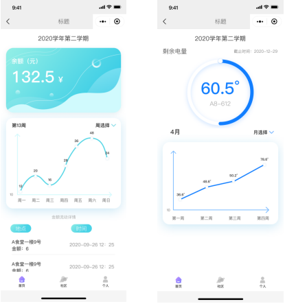 除此之外,我们在指尖移通3.0版本中的详情页面,为用户提供了美观、高效的数据罗列。通过折现图的方式,展现寝室电量的使用情况、用户的饭卡余额及使用情况。用户也可以通过周来自行筛选不同时间段的数据。