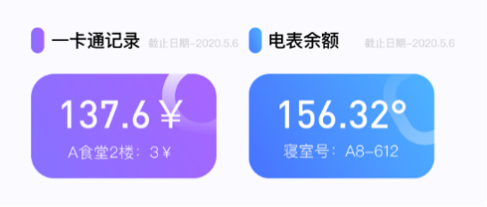 今日课表、一卡通余额、电表余额数据采用了模块化的卡片化的展示形式。如需了解详情,点击卡片即可进入相应的详情页面。