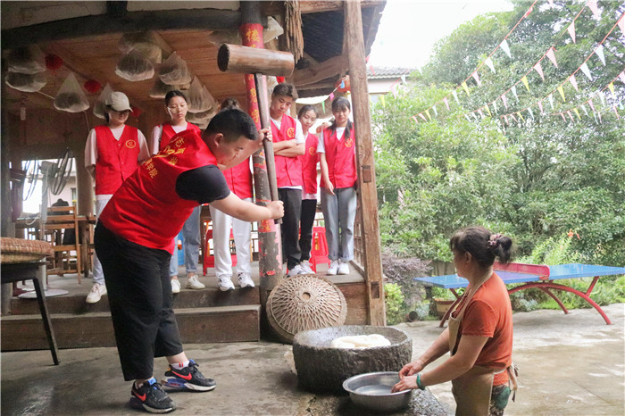 苗族糍粑作为当地特色美食,但凡有喜事,当地人都要打糍粑招待客人,以表吉利。苗族糍粑不仅是一道美食,更蕴含了深厚的文化内涵。谢阿姨给志愿者们讲解了糍粑的制作过程后,便拿出准备好的食材开始制作。打糍粑是一个细致活儿,既要速度、力度,又要配合默契,志愿者们排着队,轮番上阵,带着节奏舞动着膀子。将刚打好的糍粑裹上黄豆面,金黄透白,轻轻咬一口,软糯香甜。