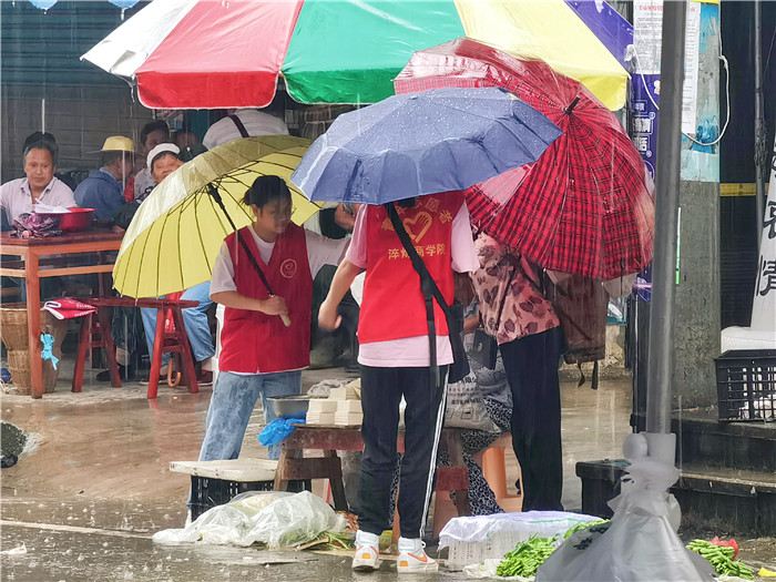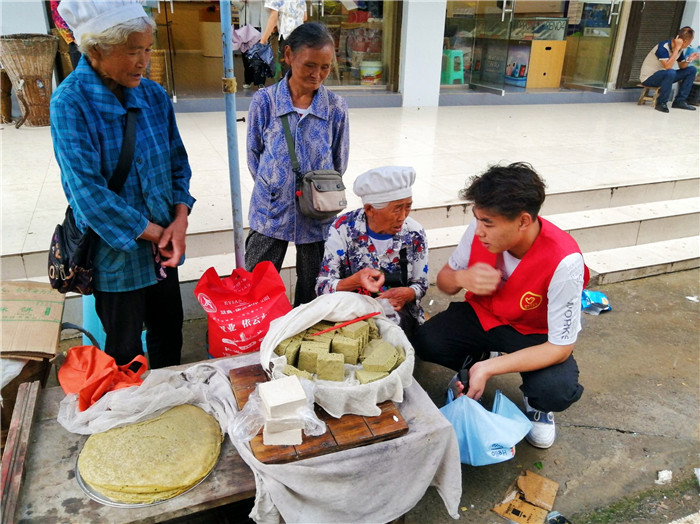 密密的雨幕中,鞍子镇大街上热闹非凡,此起彼伏的叫卖声、不绝于耳。鞍子苗寨的集市朴实无华,大部分商品都是特色手工食品,其中一道斑鸠豆腐引起志愿者们的好奇,卖豆腐的摊主奶奶热情讲解下,志愿者们了解到斑鸠叶豆腐需要用新鲜的斑鸠叶制作,是天然绿色的健康食品,也是自古以来苗寨人勤劳与智慧的结晶。突然间都滂沱大雨,阻挡了许多寨民赶集的步伐,商贩们纷纷开始收拾着货物,志愿者们迅速加入到收摊的队伍中,红马甲忙碌的身影在雨中便是一道亮丽的风景线。