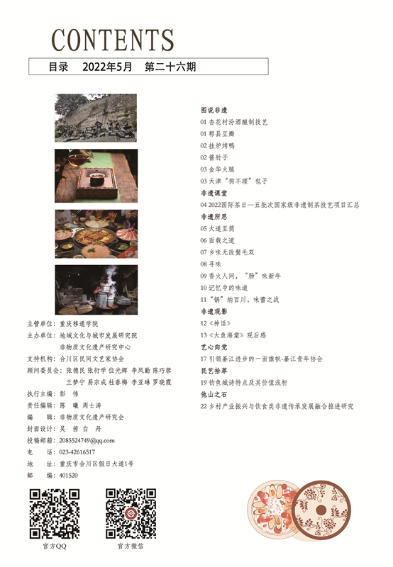 由地域文化与城市发展研究院主办,非物质文化遗产研究会主编的期刊《非遗专刊》,在时间的雕琢下迎来了第二十六期。本期以“食韵”为主题,介绍非遗饮食技艺,容纳了同学们对饮食技艺的见解以及学者们的观点。研究员们利用课余时间,通过确立主题、征稿、收录、设计、排版等一系列工作,使期刊呈现出完美效果。