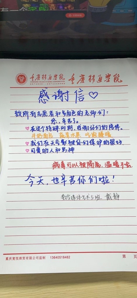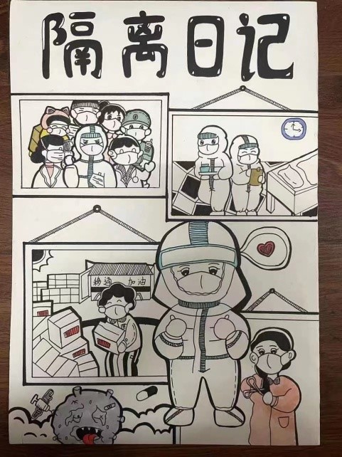 与此同时,和我们站在一起的还有可爱的同学们,防疫工作先锋队用实际行动所做的贡献,同学们都看在眼里。艺术传媒学院的同学们通过线上和线下多重渠道表达了他们的感谢与积极的生活态度。他们充分发挥专业素养,用最直观的方式表达他们的情感,创作了一幅幅可爱真挚的画面。在这些生动、具体又不失艺术美感的形象中,窥见了同学们由衷地感激之情,和老师们把学生放在心上的责任担当。