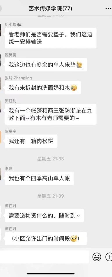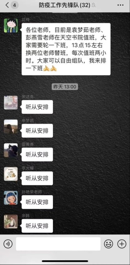 是一个人在战斗吗?不,是我们一个团队在战斗。校外的老师也时刻准备着献出力所能及的力量,做先锋老师们坚强的后盾。校外老师们主动承担校内志愿者的教学任务,积极保障后勤工作,每日在工作群里汇报工作进展,携手共肩,共克时艰,彰显着艺传人的团结奋进。
