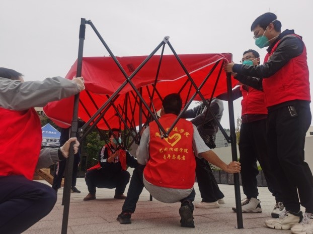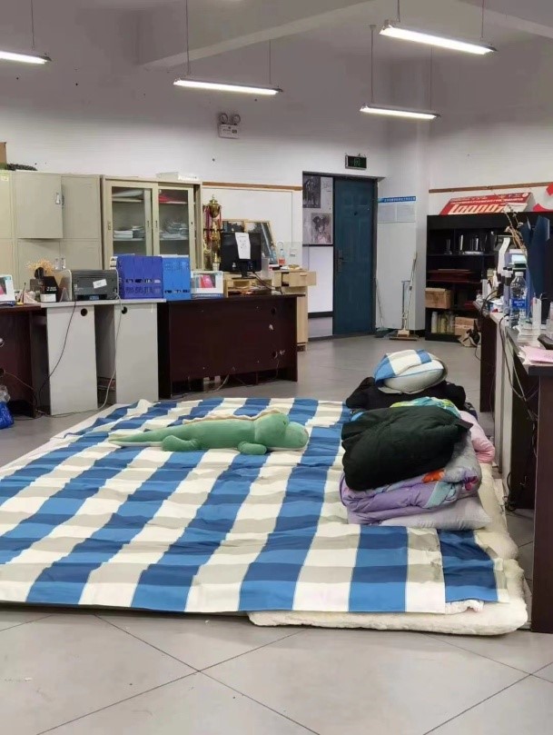 生活起居的不便、物资的紧缺、额头上深深的勒痕和腰酸背痛的体感,让教学楼办公室桌上、椅子、甚至地面成为了志愿者老师们一天忙碌疲惫身躯的休息点。但这样的艰辛也会被近几日全阴的结果治愈,大家不喊苦不叫累,哪里需要就到哪里去战斗、去坚守,志愿者们筑起校园里疫情防控中坚强的艺传风景线。