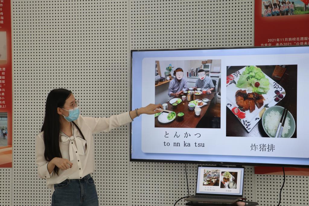 “せんせい(老师)、さくら(樱花)……”活动现场,李老师对比展示并强调了日语与汉语中“汉字”的不同之处,鼓励同学们大胆开口,发声体验日语与汉语的异同。