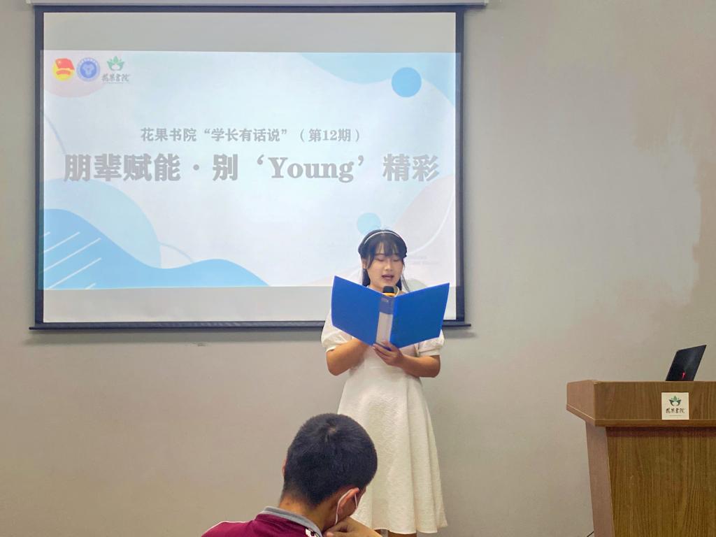 为充分发挥优秀学子榜样引领的作用,让学生成为教育工作、自我成长的主体,以“朋辈互助”实现学生的自我管理、自我教育、自我发展, 5月25日下午,花果书院以“朋辈赋能.别‘Young'精彩”为主题在多功能活动室举办了“学长有话说”(第12期)。此次活动邀请到爱莲书院二届一任学生自治委员会主席黄羽萱同学作为分享嘉宾,与活动参与者分享她的完满之路。