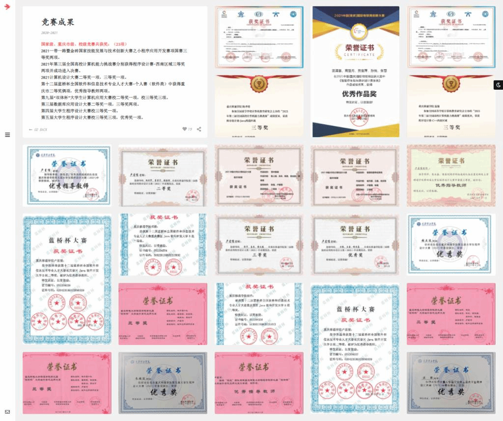 由大数据与软件学院计算机技术与应用创新中心联合汇江书院成立的“网磕儿”IT工坊硕果频传。2021一年的时间内在工坊指导老师卢星儒、杨成、彭聪、刘尚兰老师的指导下。工坊成员杨延波与彭伟同学在2021一带一路暨金砖国家技能发展与技术创新大赛均获得全国总决赛三等奖;陈孝登与温强在2021年第三届全国高校计算机能力挑战赛分别获得程序设计赛-西南区域三等奖并成功进入决赛;胡洋、邓磊同学双双荣获第十二届蓝桥杯全国软件和信息技术专业人才大赛重庆赛区软件开发大学B组二等奖;同时,由工坊成员历时半年、精心打磨的2项参赛作品《雪中困境》以及《智慧校园考试系统》分别在2021中国大学生计算机设计大赛重庆市级赛中荣获二等奖和三等奖。其余各项校内程序设计竞赛共计23余项。