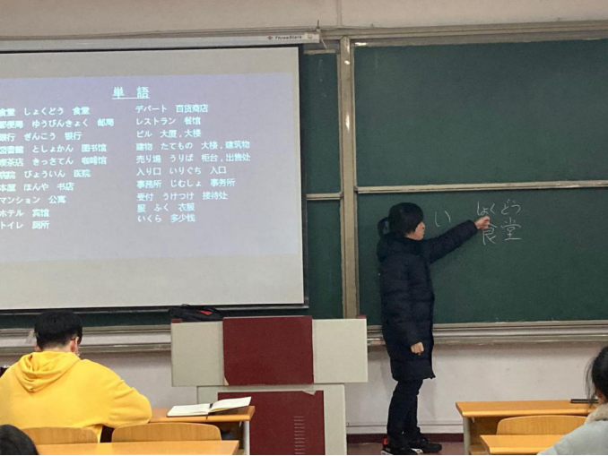 授课老师在教习了单词的基础上为大家讲解了与其相关的一些基本语法,主要是场所的指代和一些价钱的询问方式,以主谓格式的简单语法结构为主,且最后的课文应问答的方式,让同学们试着自己能简单翻译出句子的意思和一用为大家表现了一段对话,用问答的形式来帮大家将教过的知识点再复习一遍,也通过些单词的含义,这让这节日语课的课堂充满了互动感与趣味。