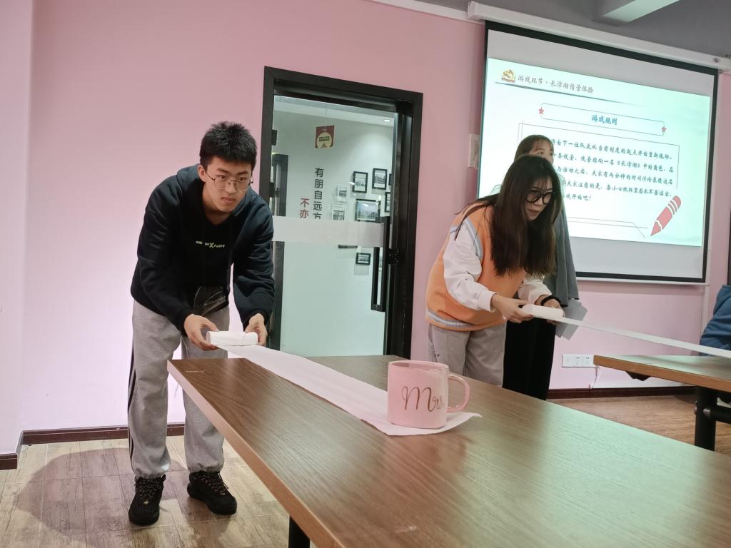 在认真的听完主持人的讲解、看完电影片段后,同学们对人民志愿军战士充满了敬佩。为了让同学们学习志愿军的谨慎、坚持、团队协作精神,铭记这段历史,我们开启了做游戏获取线索、拼凑历史人物故事的环节,同学们10人为一组,每个人要用纸巾拖动装满水的杯子,将杯子移到对应位置,从而获取历史线索,最后十个同学用得到的线索拼凑出历史故事进行学习、分享。活动中,同学们模仿着人民志愿军的站姿,谨慎地拖动装满水的茶杯,杯中满满的水时刻考验着同学们的手平衡和心平衡。同时,同学们还通过线上答题来巩固本次活动中所涉及的相关知识,进一步加深同学们对本次活动的印象。相信用努力学到的历史知识更能让同学们铭记于心,爱国精神也将不断传承。