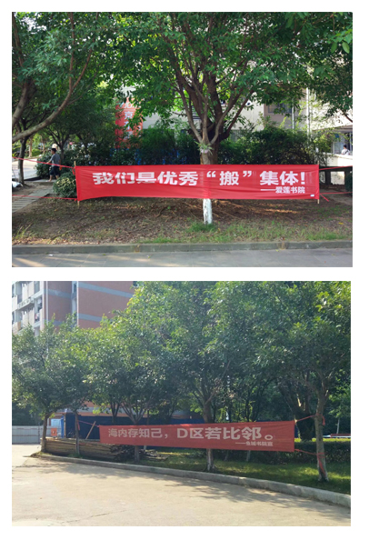 搬迁前夕,各书院在宿舍区域拉起了一条条关怀备至且温馨的横幅。“我们是优秀的‘搬’集体”,“昨天,今天明天我们与你同在”“欢迎小伙们随时回来串门”。书院的小伙伴们希望,不论搬到哪儿,我们都是一家人,希望一直陪伴着同学们。