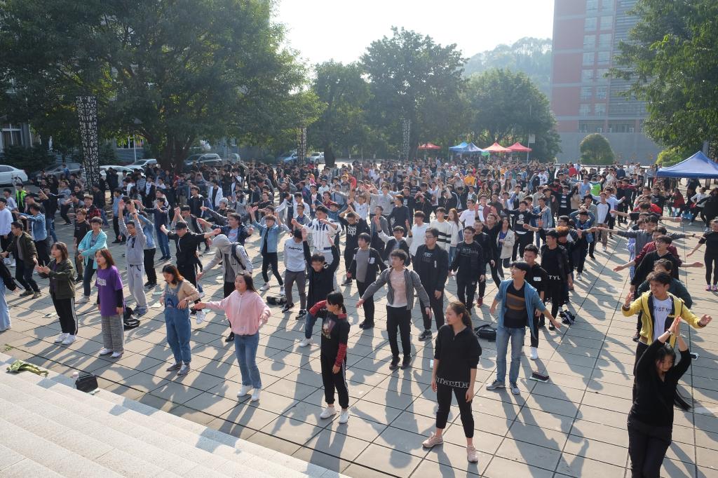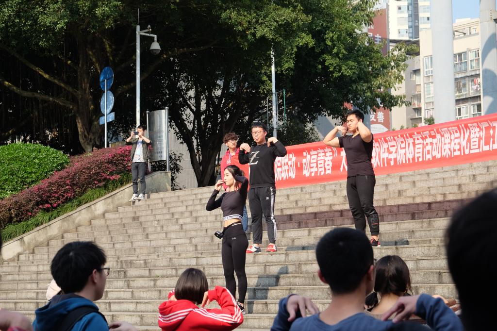 运动的余热尚未散去,“大数据与软件学院体育活动课程化与汇江书院特色课表建设”第一课于3月20号下午4:00正式开课,同学们身着轻便的运动服在黄桷树广场排列着整齐的队伍等待活动开始。第一课授课“教师”是来自我校健身协会的学生,他们为了上好第一节课,认真排练长达两个星期。随着音乐的响起,同学们在健身协会同学的指导与示范下开始了身体各个部位的拉伸。当天阳光正好,同学们从有点不好意思到沉迷其中,从不愿动到不愿停,大家的运动热情在此次活动中找到了释放点。现场聚集了许多师生驻足观看,一位来自艺术传媒学院的学生称赞:“从未见过这么多同学集中运动,这种有专人指导的运动比自己运动更有参与感和体验感。”还有学生在活动结束后说道:“这么多人一起参加,感觉可以申报吉尼斯纪录。”