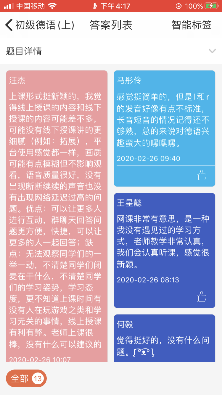此外老师们还采用了各种手段进一步提高学生的口语表达能力, 比如要求学生连麦进行自我介绍,老师会及时引导其他同学对发现其中的问题,并提出自己的建议,通过这样的师生、生生互动,既提高了学生开口说德语的勇气,又给了其他的同学锻炼自己的听力和运用所学知识和词汇的机会。