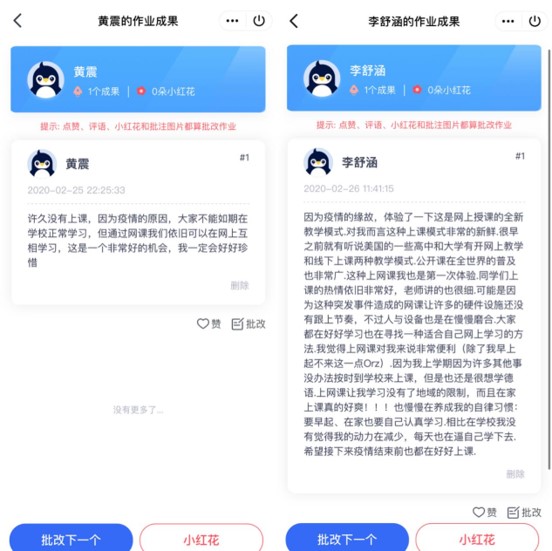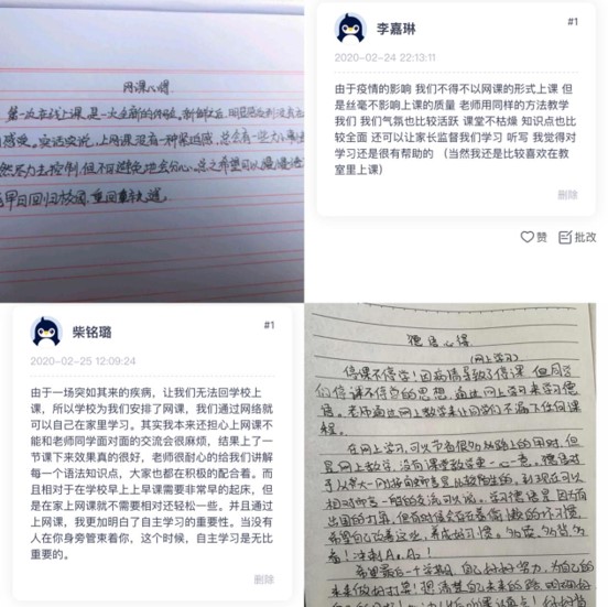 学生们则认为,网络课程不仅带来了新鲜感,而且让自己与老师之间的关系更加的亲密,空间的距离感反而让学生和老师心灵之间的距离更近。学生们既可以在线上直播中随时与老师互动,在线下直播结束之后还可以回看不理解之处,既不耽误其他同学的时间,也能提高学习效率。