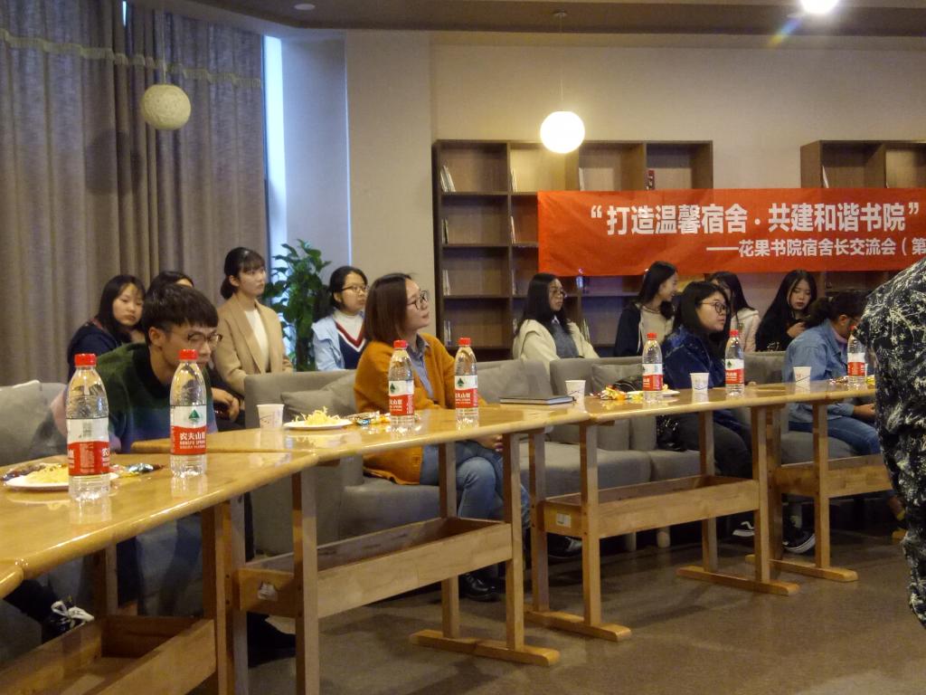 大学是人生新的开始,寝室是大学除了家以外最温暖的地方。环境对人的影响及其大,大学的寝室氛围决定了大学生活是否舒心。2017年11月10号下午四点,花果书院在学校咖啡厅举办了“打造温馨宿舍,共建和谐书院”宿舍长交流会。本次活动邀请到了花果书院学生自治委员会的指导老师曹玉姣老师,主席陈根根学姐和唐杰学长以及各部门部长。嘉宾和众寝室长们一起度过了一小时的轻松、愉悦的美好时光。参加论坛的寝室长们收获满满,对寝室用电和寝室相处之道都有了更加深刻的了解。