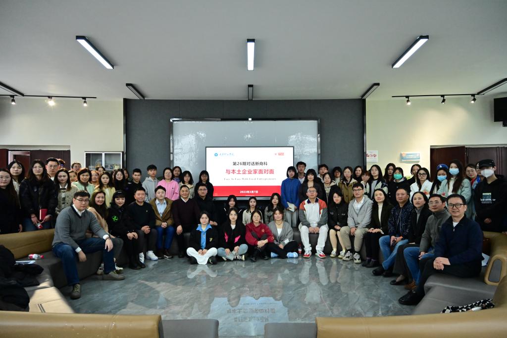 3月7日上午11点整,南湖书院创意工坊,淬炼商学院老师与来自全校各专业的40多名学生代表,以最热烈的掌声,迎来了期盼已久的参加第26期对话新商科活动。参加本次活动的嘉宾阵容前所未有,有珍爱湿巾品牌创始人黄诗平先生、小二郎传媒创始人姜军先生、中国新商科大学集团联席董事长彭鸿斌博士以及各自高管团队。