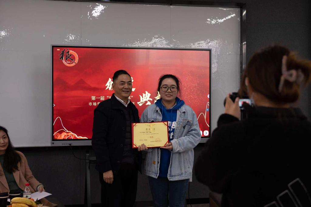 伴随着欢快的乐曲,隆重又简洁的作业大赛领奖仪式正式开始了。彭董为大家揭晓了一等奖与二等奖的获奖名单。此次作业大赛,共有69个小组分别获得了一、二、三等奖和优胜奖。重庆华联卫生用品有限责任公司的董事长黄诗平先生颁发了一等奖后,随即回答了市场营销专业的徐蔚琪同学提出的第一个问题“黄总是怎样下决心创业的?创业的第一笔资金是从哪里获得的?”