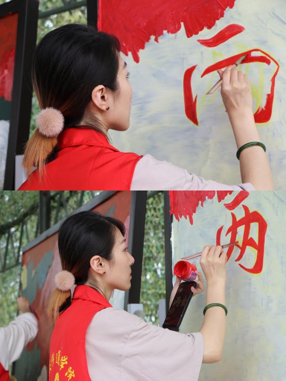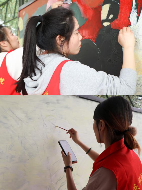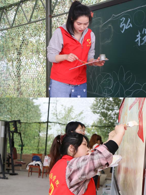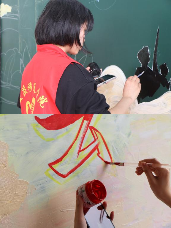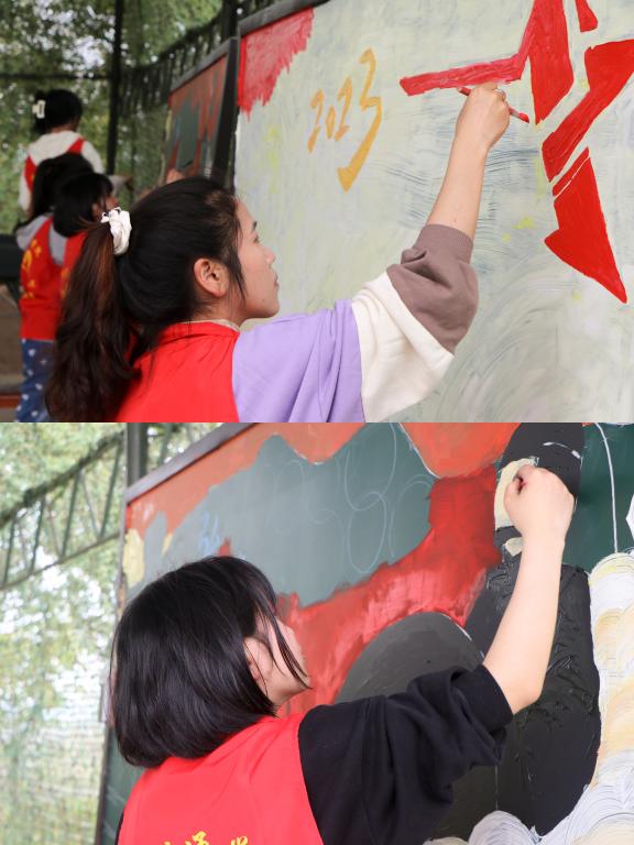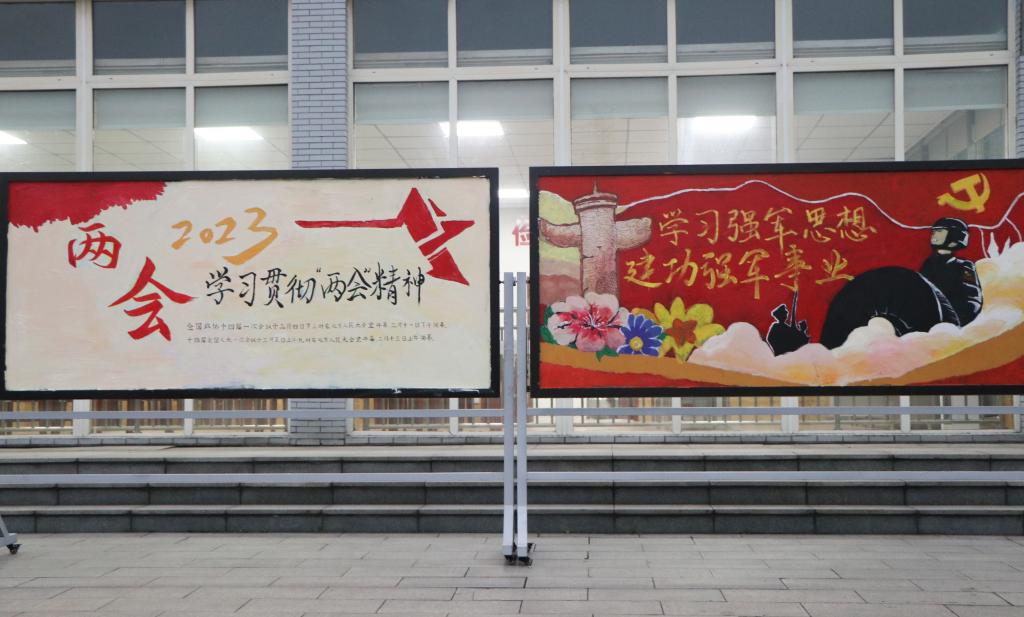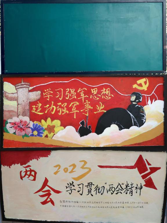 艺术传媒学院青年志愿者们在指导老师许静老师、主席们的带领下,到达武警中队后,见证了武警队员们整齐划一、严肃庄重的训练过程,感受到他们积极向上、保家卫国的情怀与精神,随即分配好工作,志愿者们有条不紊地进行着手中的任务。从“学习强军思想,建功强军事业”到“2023学习贯彻两会精神”,志愿者们一步步描图、修正、上色、写字,志愿者们用一线一笔,描绘出红色军旅的文化;用硬朗的线条绘画出他们的脸庞;笔下的那一抹红,是志愿红不忘初心的续写。