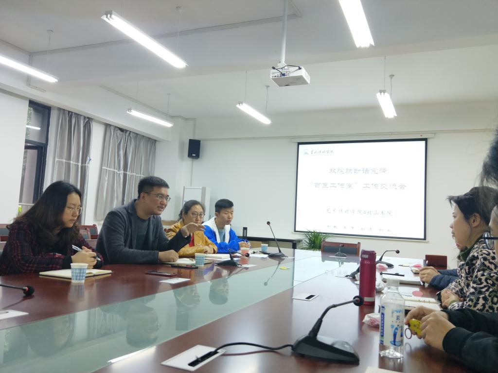 2019年4月2日上午十点,重庆邮电大学移通学院北山书院与艺术传媒学院就双院模式下的共建共育工作,以及北山书院“百匠工作室”项目的联动融合方案进行了一次座谈交流。书院部副部长穆春江老师、艺术传媒学院副院长龚晓雪老师、副院长李克伟老师、北山书院综合办公室主任冯元老师,以及艺术传媒学院动画、数媒专业的辅导员姜璐老师、李欢老师、卢伯年老师与两位专业教师代表以及北山书院的两位学生发展导师共同参与了此次交流会。