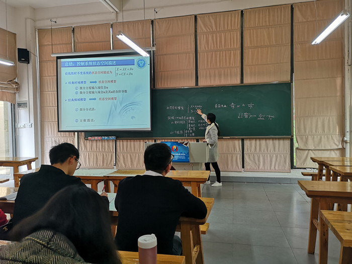 王海云老师首先引出线性时不变系统的频域模型和该线性时不变系统的状态空间描述,进而引出经典频域模型转换为状态空间模型的两种方法为部分分式法和方框图法,并重点讲解了方框图法中的串并联处理法和单一回路处理法。对于每一种转换方法,王海云老师都非常详细地演练推导,然后再结合对实例的讲解,加深学生对知识点的理解与运用。在整个授课过程中,王海云老师授课逻辑清晰,声音洪亮,课程氛围轻松自在,PPT与板书相结合,帮助学生全面地掌握知识点,得到听课老师们的一致好评。
