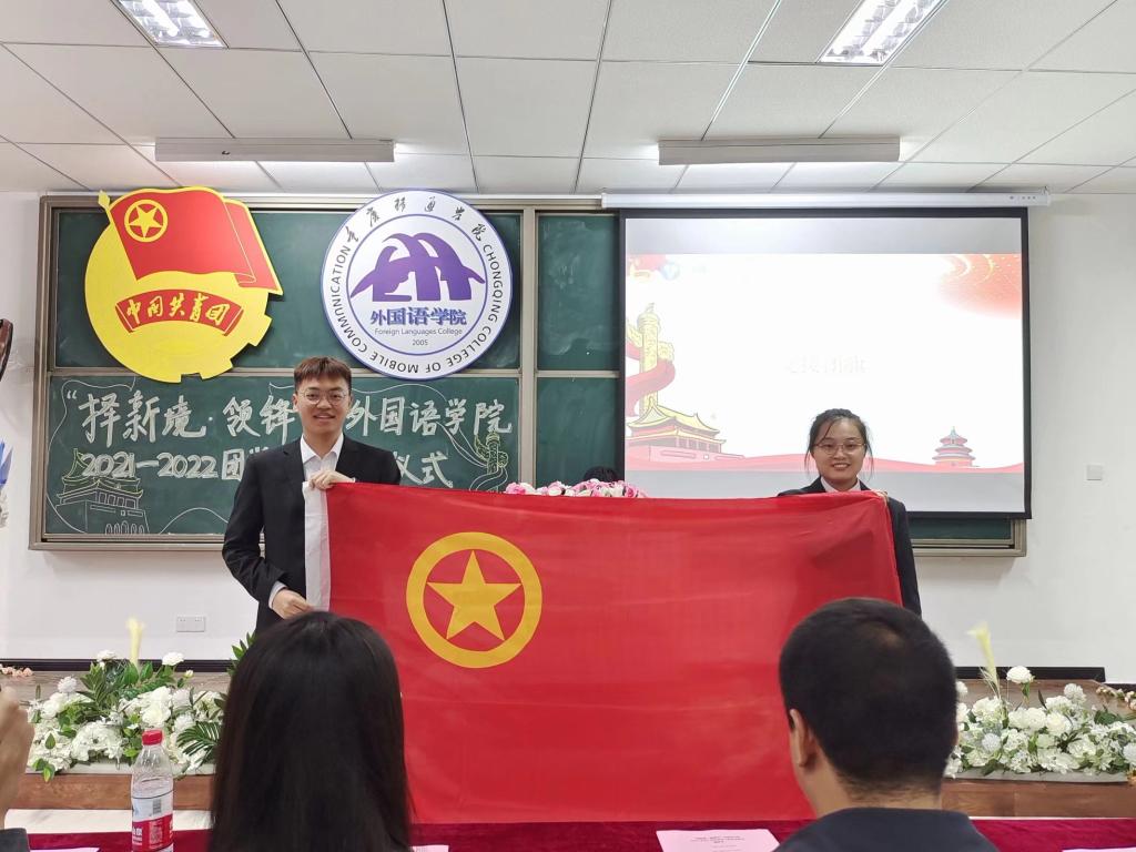 外国语学院团总支书记吕戈老师宣读完《外国语学院第三届第三任学生干部名单》后,进行本次最有仪式感的环节——交接团旗。第三届二任团总支学生副书记陈佳伶将团旗递至第三届三任团总支学生副书记吴德亮的手中,团旗的交接像是一个轮回,薪火相传,生生不息,这既是一个终点也是一个新的开始。注入新鲜血液的外国语学院三届三任学生组织也将再度扬帆起航,浩然前行!