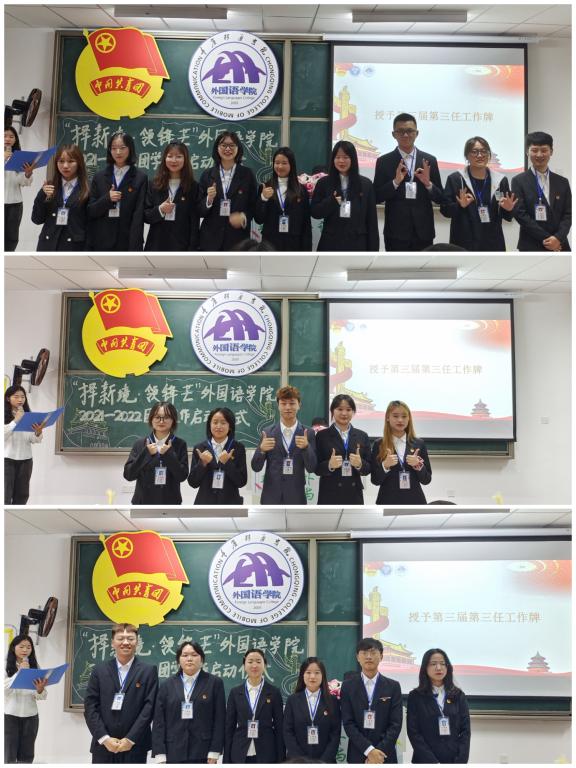 勤恳务实是外国语学院三届二任学生组织干部工作态度的写实,那逐字逐句修改的策划案与新闻稿、那越办越好的活动、那艳阳下奔波的身影都证明着他们在学生组织工作中的辛勤付出。外国语学院副院长祝玮老师与团总支书记吕戈老师分别为外国语学院三届二任学生组织主席团以及干部代表依次颁发聘书。