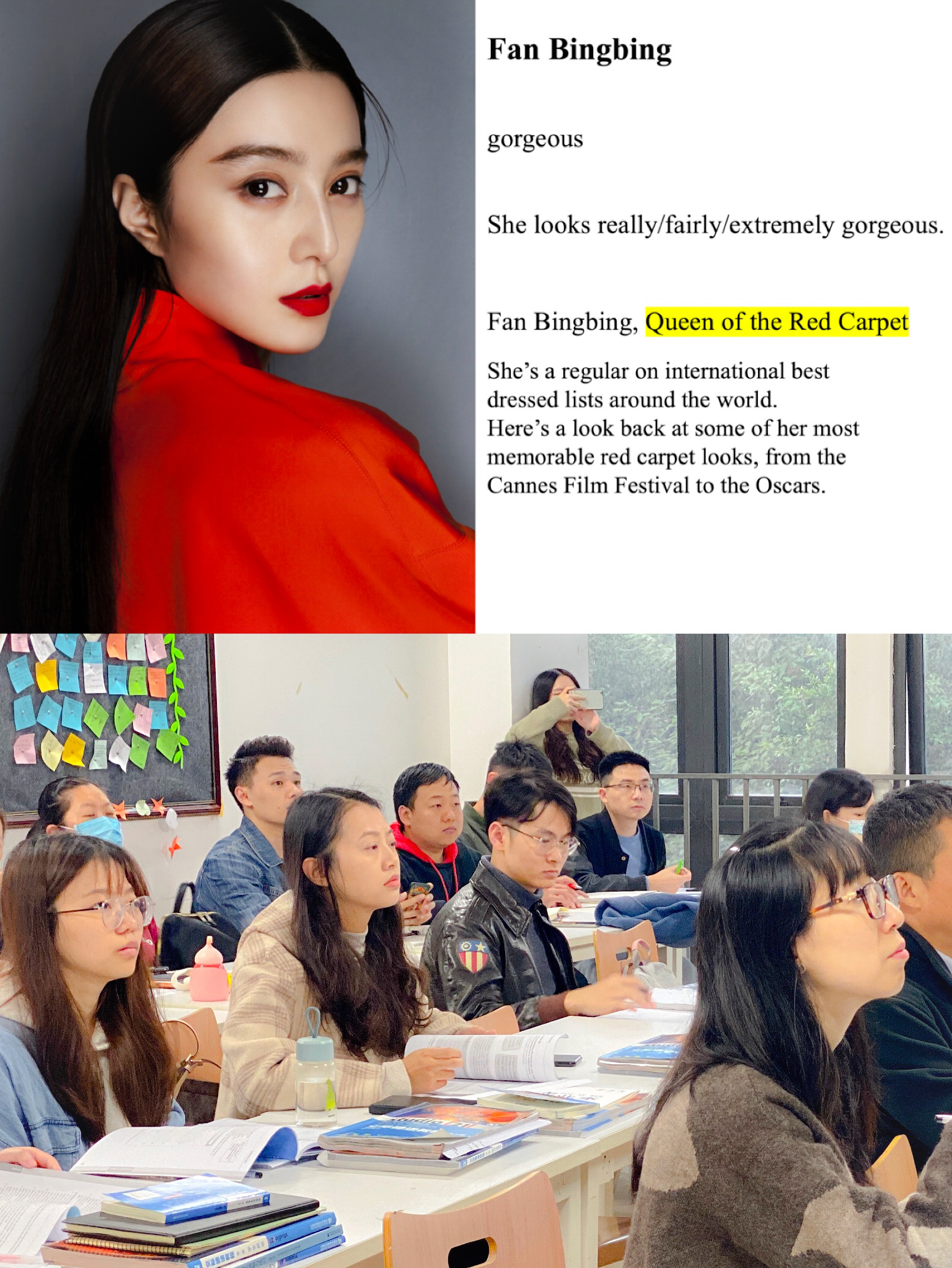经过话题引入后,杨老师针对大多数中国学生普遍存在的对于雅思口语考试词汇运用的担忧问题详细剖析,许多同学在备考雅思时会有很大的误区,以为词汇难度越高,越罕见分数越高。杨老师对此一针见血指出:一味追求所谓的高级词汇反而可能造成“大小词混用”严重问题,口语词汇的精髓是在日常口语中真正会高频使用的词汇。通过细节引入的方法,杨老师阐释了雅思口语考试中现实而常见的高分词汇,并通过对人物的外貌(appearance),性格(personality)和工作(profession)三大特征的描述,串联成一个完整的雅思口语第二部分名人话题的回答。