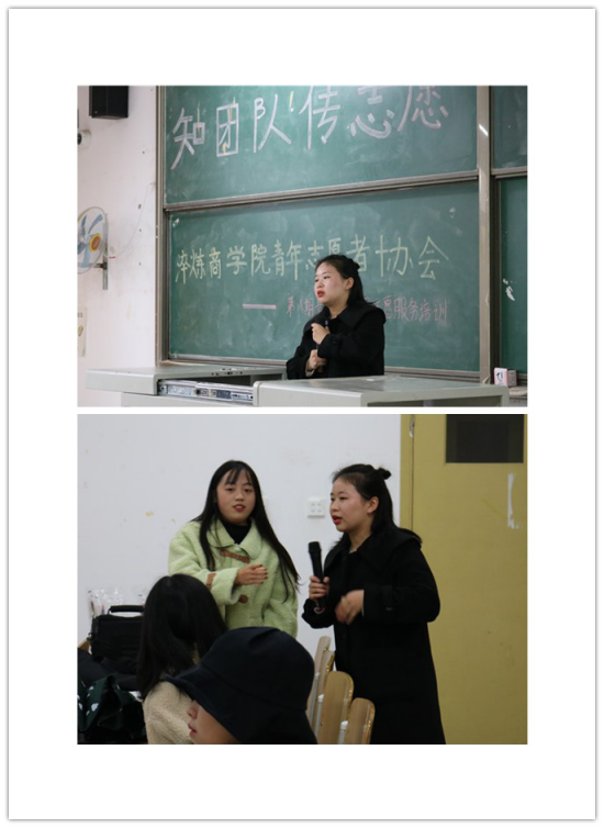 为弘扬“奉献、友爱、互助、进步”的志愿精神,以及如何让同学们管理好志愿者团队,和让更多同学积极参与到志愿者活动中来。重庆邮电大学移通学院淬炼商学院青年志愿者协会于2020年12月3日在5102召开以“知团队·传志愿”为主题的志愿服务培训骨干班活动。本次活动有幸地邀请到杨太丽和王虹忆两位学姐兼支队长对同学们进行志愿者团队的管理培训。