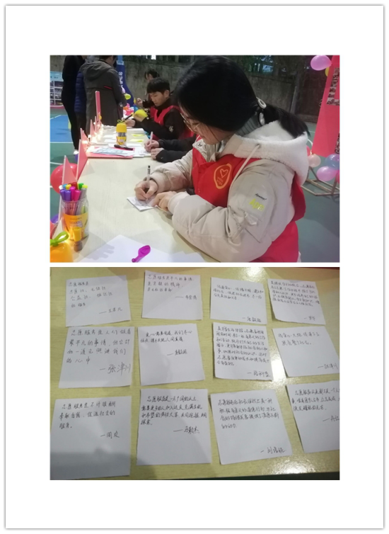 “这个社会需要爱,我将满载爱散播社会”朱宗峰曾言。听完两位学姐的倾心分享,同学们也产生了思考,在心底更加坚定了对志愿服务的追求,也升华了对志愿精神的理解。一张张便签,一句句话语便是最好的见证!短暂的沉思,坚定的眼神,有力的笔道,写下自己心中的志愿服务!便签上,内容或长或短,言语或简或繁,每一字句皆是同学们对志愿服务的热爱!同学们知道了管理一个团队的不易,也明白了只有坚持初心,不忘本来,秉持志愿服务理念,用最赤诚的心为社会,为需要帮助的人付出,才能在志愿者这条道路上继续前行。