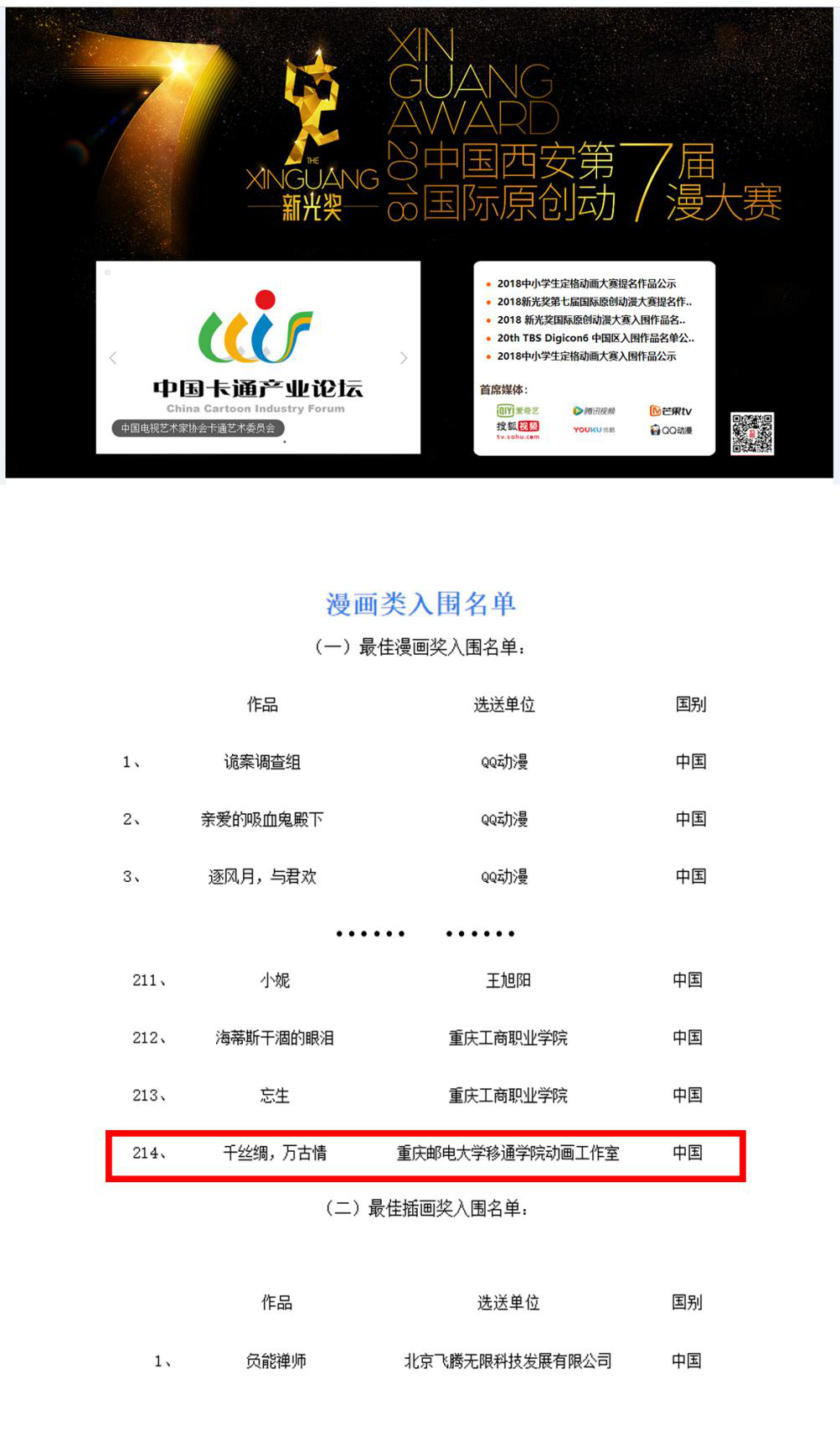 公布征集作品范围、大赛章程细则。刘应晶老师组织学生参加了“2018新光奖·中国西安第七届国际原创动漫大赛”,工作室学生提交了动画、漫画、插画等类型的作品,其中动画专业学生刘琼黛、王润苏、陈天娇、郭子鉴四位同学所创作的漫画作品《千丝绸,万古情》成功入围最佳漫画奖,在这一个月的努力当中,每位同学全力以赴,通力协作,不断挑战自我。