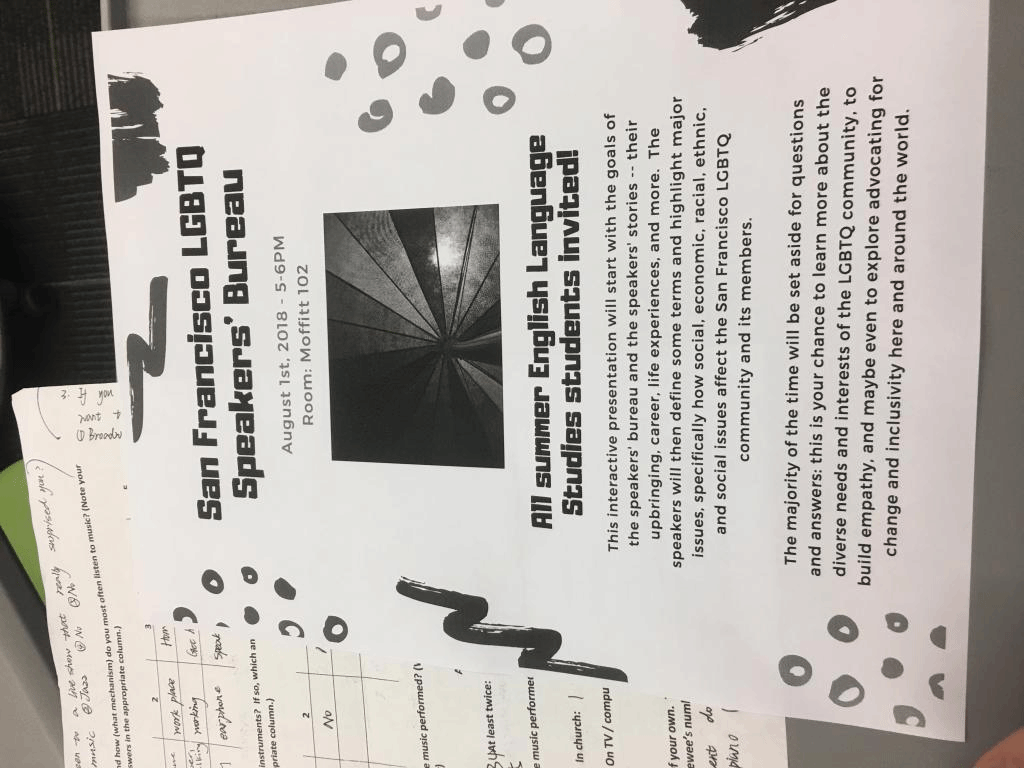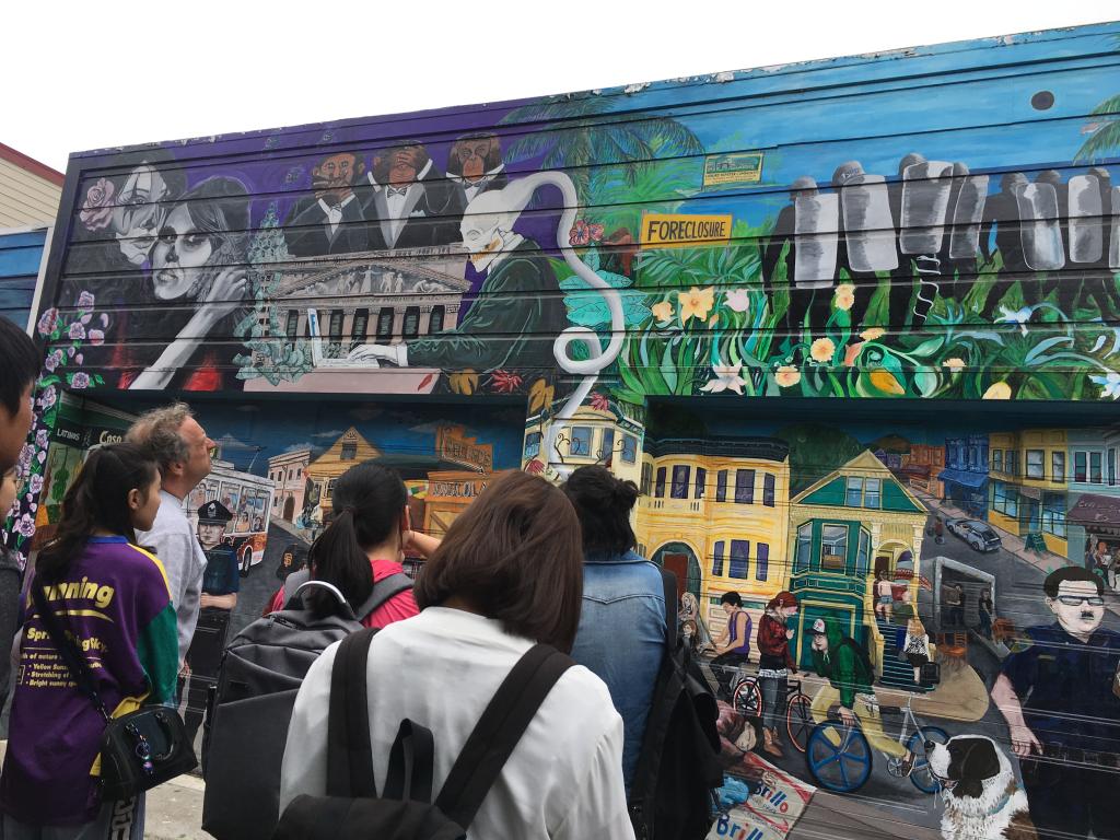除了看朋克摇滚的演出,也有参加一次LGBTQ交流会、分享两首自己喜欢的歌、去一次旧金山市区看世界闻名的涂鸦墙Balmy Alley、去观看一场露天音乐会……诸如此类的课外作业,但是光参加还不够,除了朋克摇滚演出的那次,其余的每个活动结束后我们都需要写一篇相关文章,也是作业的一部分。至于为什么不用写朋克摇滚演出的文章,Matt解释说因为不是所有人都能接受或者喜欢这样的音乐,所以不强求大家写。这种看似随意却又不失规范的教学制度、看似自由却又相互尊重的师生关系都带给我很大的触动。