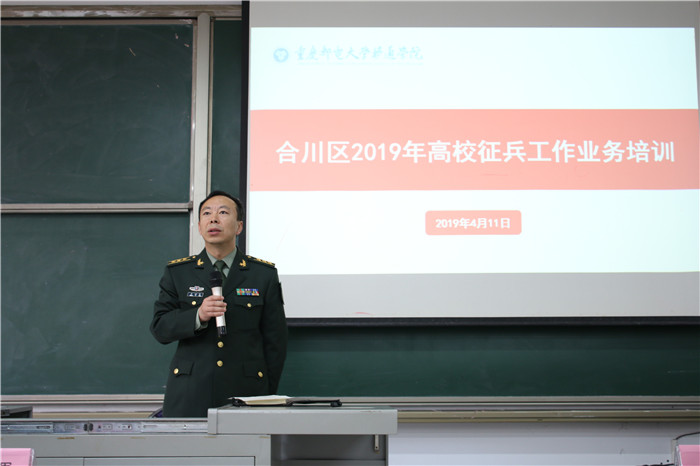 合川区武装部副部长王利军从“高校征兵工作面临形式”、“目前存在的问题”、“下一步的工作要求”等方面做了重要讲话,强调了本次培训的目的和重要意义。王部长表示:“2018年重庆市高校征兵情况良好,大学生征集比例为70%,其中毕业大学生占25%,位于全国前列。”同时,他也分析了目前部分高校在征兵过程中存在的问题,他指出,由于许多辅导员对征兵相关政策、流程并不清楚,不能更好地开展征兵工作,大大降低了高校的征兵效率。不仅如此,现在也存在征兵配套的措施不足的问题,例如体检时间有变,学生经常因为表格问题等来回跑动等。他还说到,征兵工作人员与辅导员要对学生加强正面引导,从形势政策以及军人待遇来鼓励学生报名。