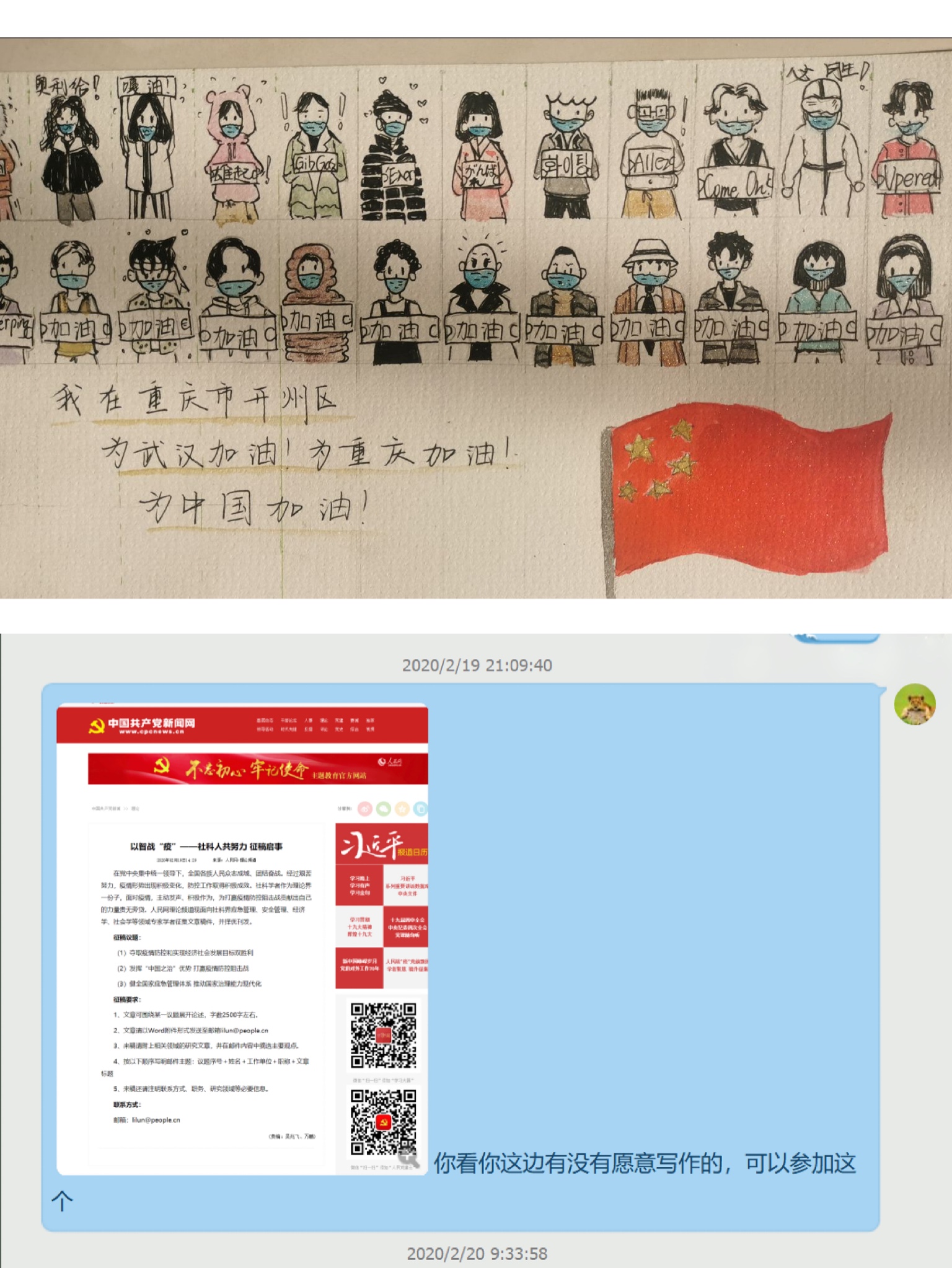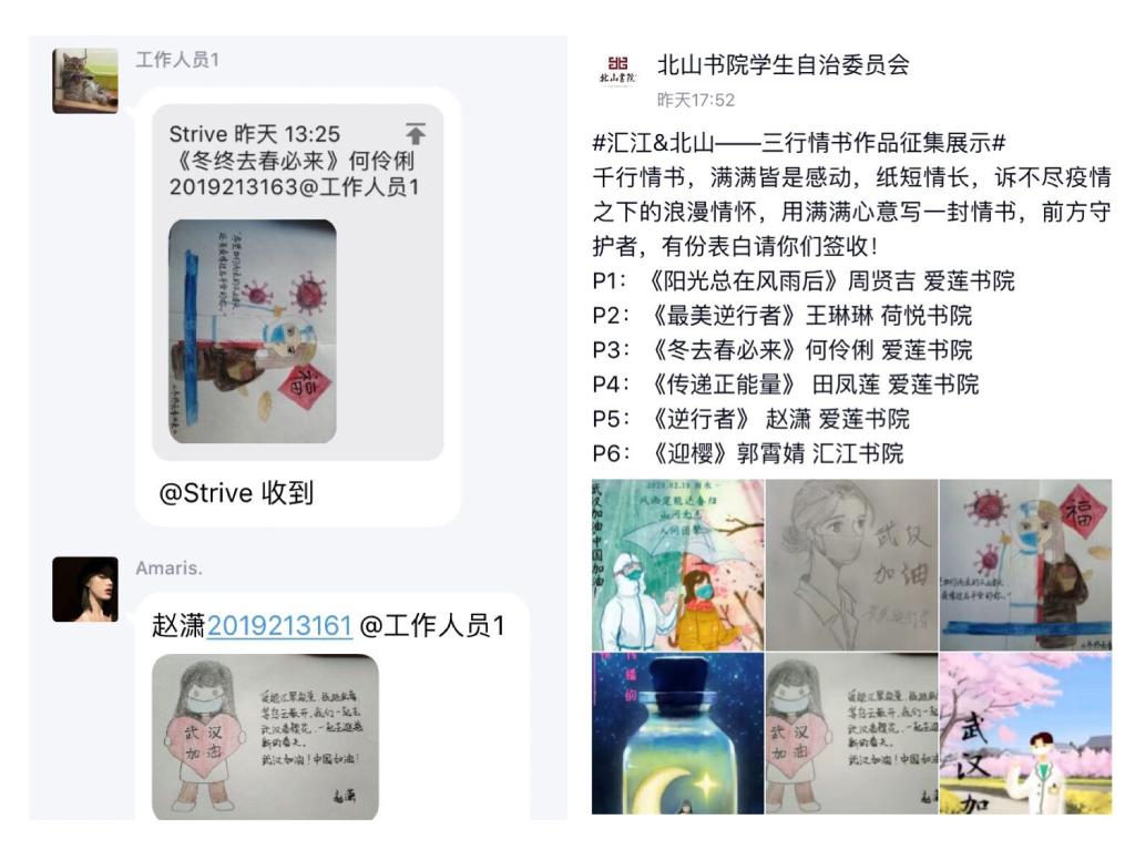 2月18日-25日,北山书院与汇江书院联合推出“武汉加油·辗转于书”——“三行情书”作品征集活动,倡导和号召广大青年学子向奔赴一线无私奉献的工作人员表达感谢和鼓劲。 活动共120余名同学积极参与投稿,北山书院与汇江书院在活动期间联合展示和推送了70余份优秀作品,作品风格多样,涉及手绘漫画、文字诗歌、人物海报、助威视频等,展现了移通学院学子的青春正能量,凸显了移通学院学子的心系家国情怀。